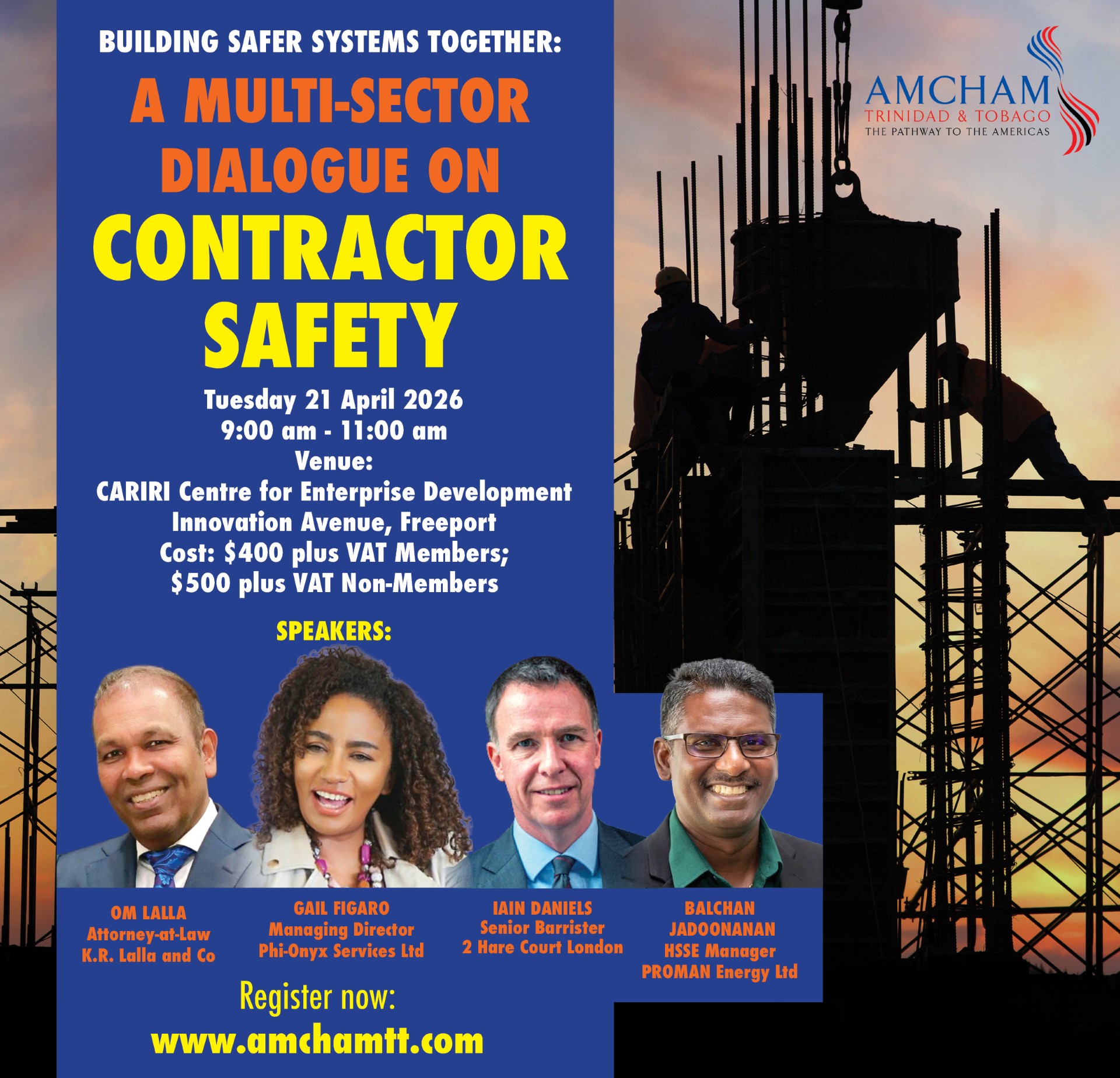 Join us for "Building Safer Systems Together: A Multi-Sector Dialogue on Contractor Safety," a vital workshop addressing Trinidad and Tobago's lack of a standardized Safety Training Observation Workshop (STOW) framework, where fragmented contractor safety practices in high-risk sectors like energy, construction, and petrochemicals heighten vulnerabilities. This collaborative event brings together business leaders, government officials, labour representatives, and NGOs—championed by AMCHAM T&T—to foster open dialogue on practical, locally tailored solutions, including shared safety protocols, risk assessments, training standardization, joint audits, and behavioral programs that prevent accidents and build accountability. Attendees will drive key outcomes like consensus on interim benchmarks, resource-sharing for toolkits, and pilot commitments to cultivate a unified safety culture, empowering multi-employer worksites to thrive securely—register today to shape safer systems for our community.