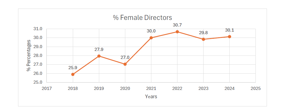 · The percentage female directors rose from 25.9% (2018) to 30.1% (2024)